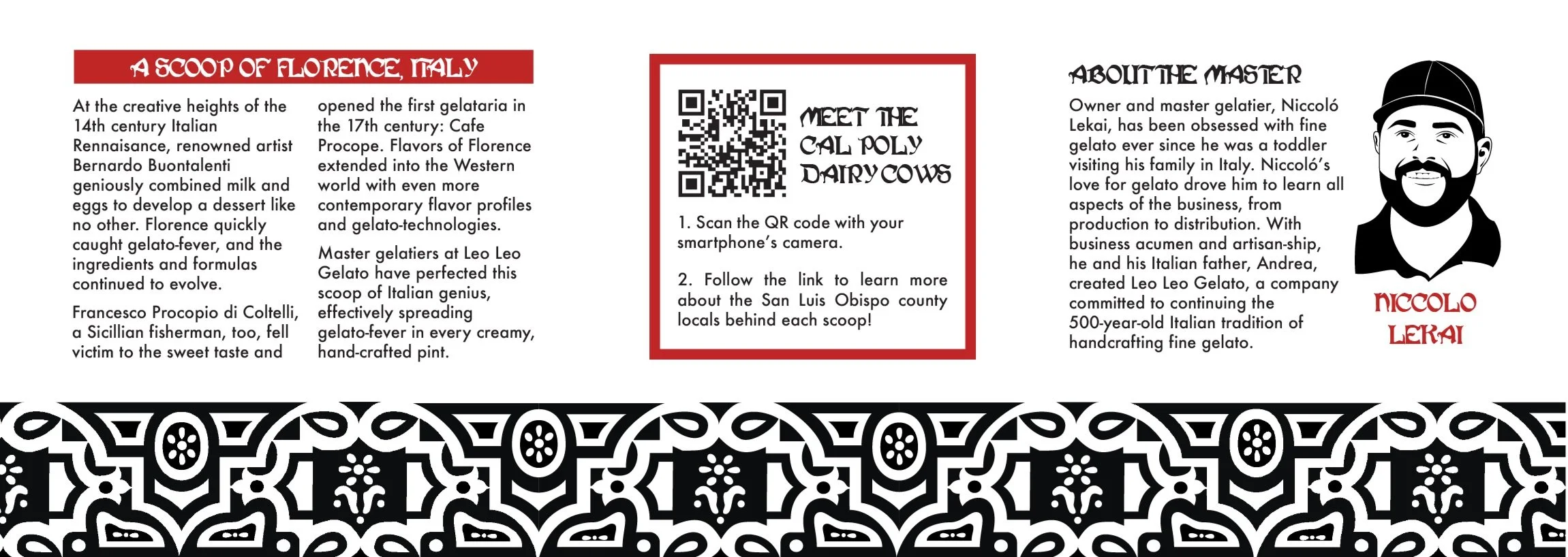 Paso Robles gelateria Leo Leo Gelato teamed up with Cal Polyās Consumer Packaging class to task student teams with redesigning their artisan gelato and sorbetto pints. Combining owner Niccolò Lekaiās vision for the brand, market research, and our own creative liberties, our team developed an eye-catching, structurally-unique, and modern redesign.