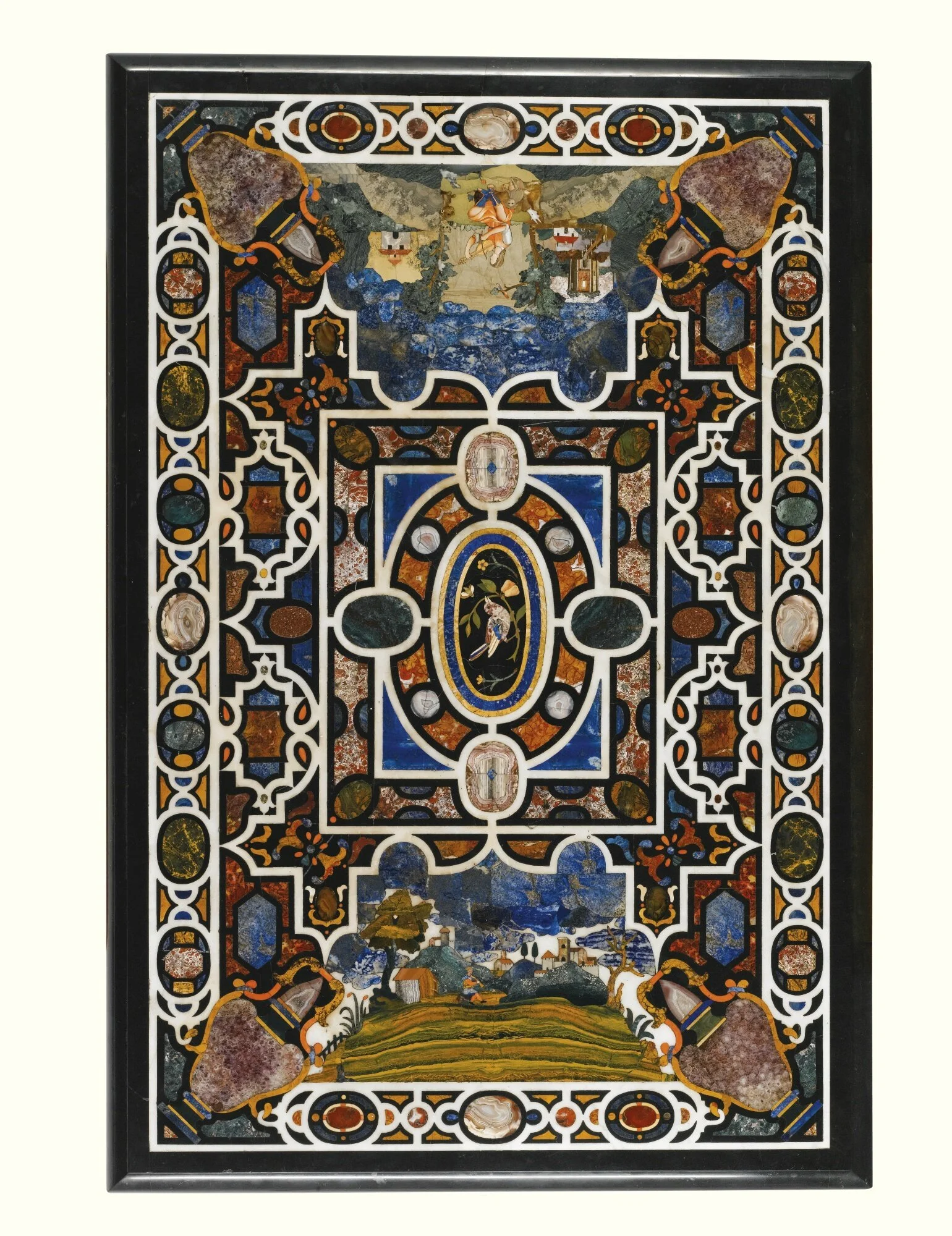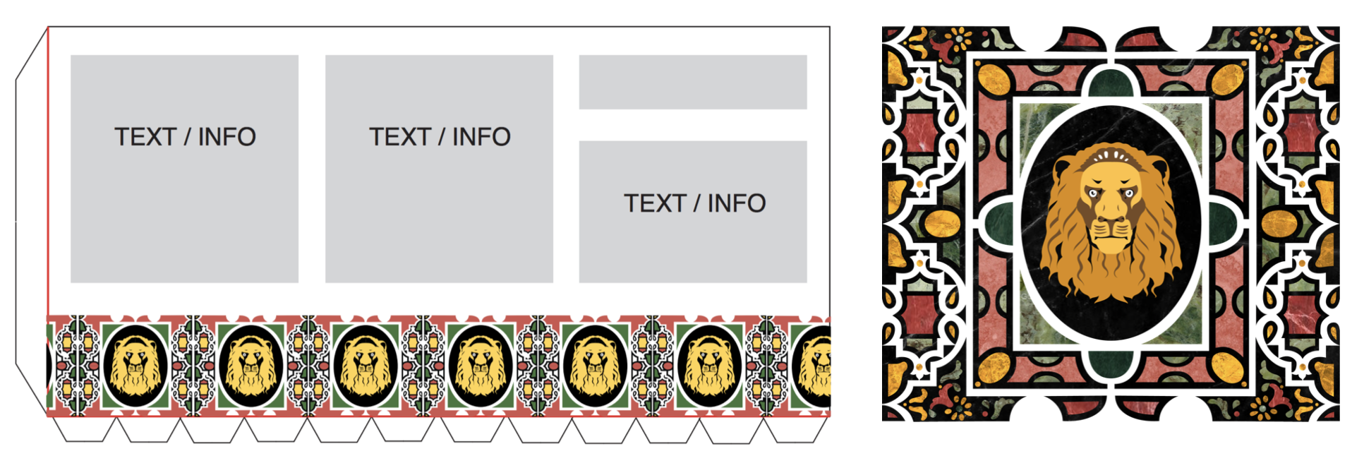 I selected this Italian inlaid table top from ~1620 as the key reference for the packaging artwork. Early designs showcased a lion as well as bold mosaic colors and textures. However, upon rendering, this graphic was too noisy and incongruent to other design features.
